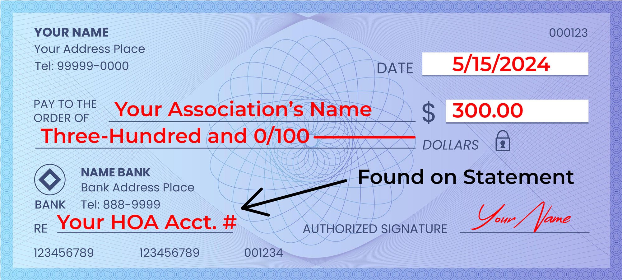 Please reference the check sample below for how to make out your check for your HOA Dues.